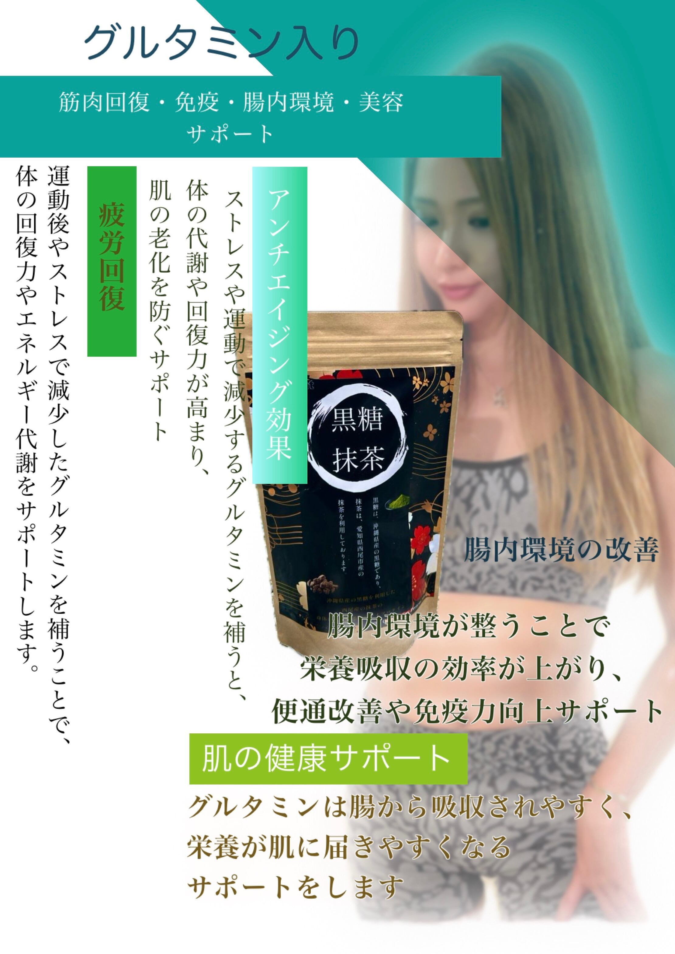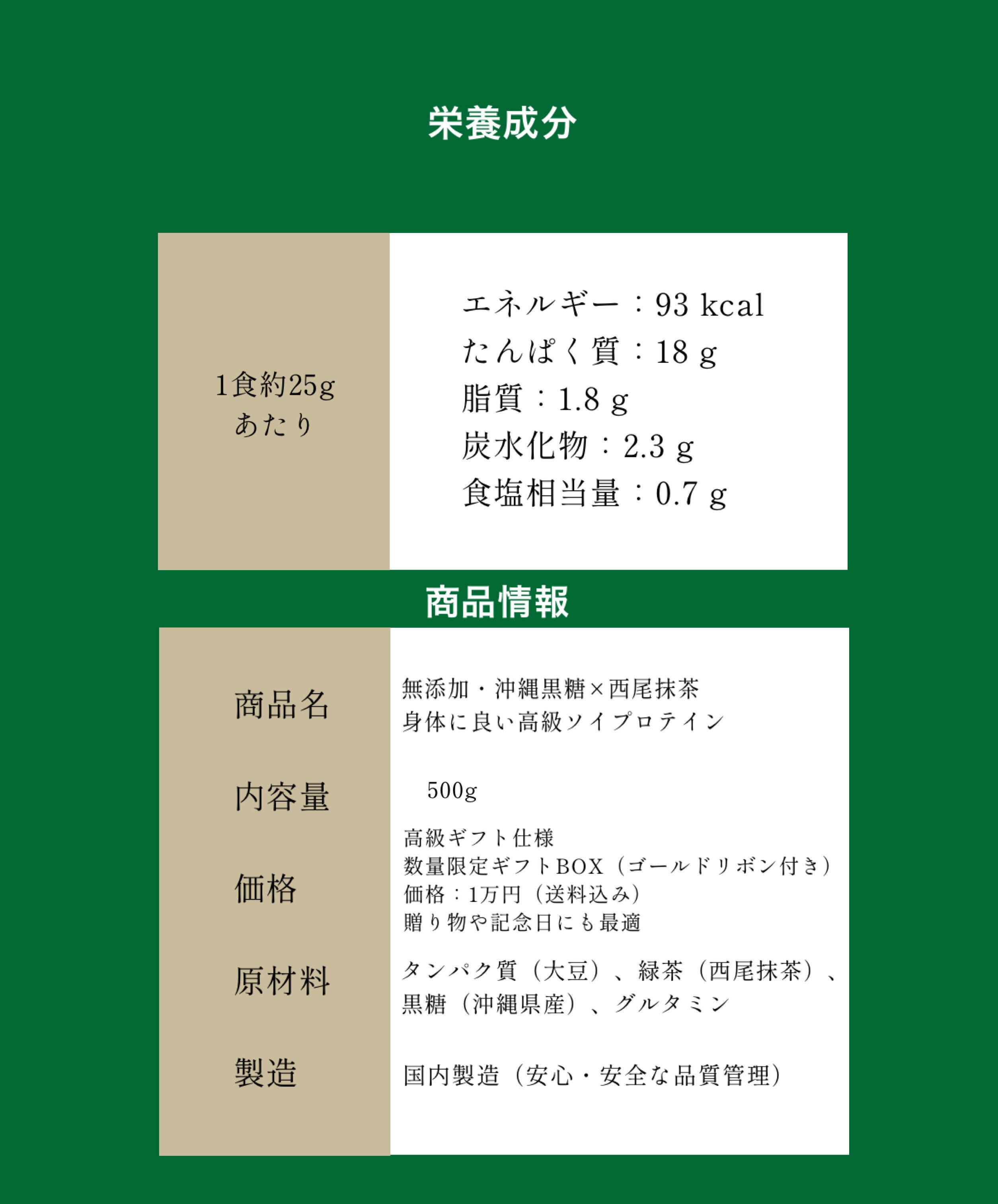 • 原材料:タンパク質(大豆)、緑茶(西尾抹茶)、黒糖(沖縄県産)、グルタミン